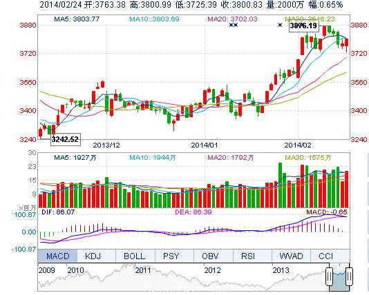 今開: 3763.38 最高: 3800.99 昨收: 3776.13 最低: 3725.39 成交量: 2000.42萬(wan) 手 振幅: 2.00% 成交額: 229.51億(yi) 元