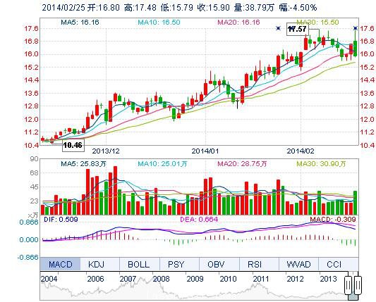 今開: 16.80 成交量: 38.79萬(wan) 手 振幅: 10.15% 最高: 17.48 成交額: 6.51億(yi) 元 換手率: 4.07% 最低: 15.79 總市值: 167.31億(yi) 市淨率: 4.75 昨收: 16.65 流通市...