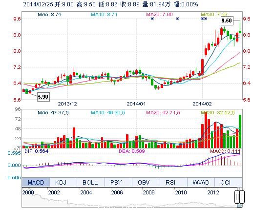 今開: 9.00 成交量: 81.94萬(wan) 手 振幅: 7.20% 最高: 9.50 成交額: 7.54億(yi) 元 換手率: 9.20% 最低: 8.86 總市值: 79.22億(yi) 市淨率: 2.94 昨收: 8.89 流通市值: 79...