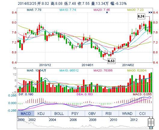 今開: 8.02 成交量: 13.34萬(wan) 手 振幅: 7.44% 最高: 8.08 成交額: 1.04億(yi) 元 換手率: 3.05% 最低: 7.48 總市值: 32.98億(yi) 市淨率: 2.41 昨收: 8.06 流通市值: 32...