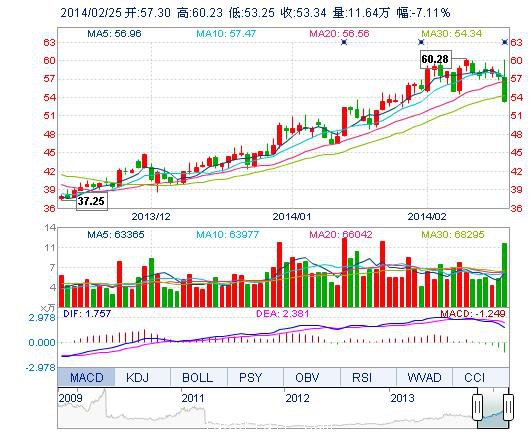 今開: 57.30 成交量: 11.64萬(wan) 手 振幅: 12.16% 最高: 60.23 成交額: 6.64億(yi) 元 換手率: 4.05% 最低: 53.25 總市值: 158.77億(yi) 市淨率: 10.46 昨收: 57.42 流通市...