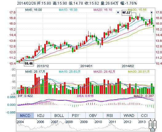 | 今 開: | 15.80 | 成交量: | 26.64萬手 | 振 幅: | 7.04% |