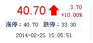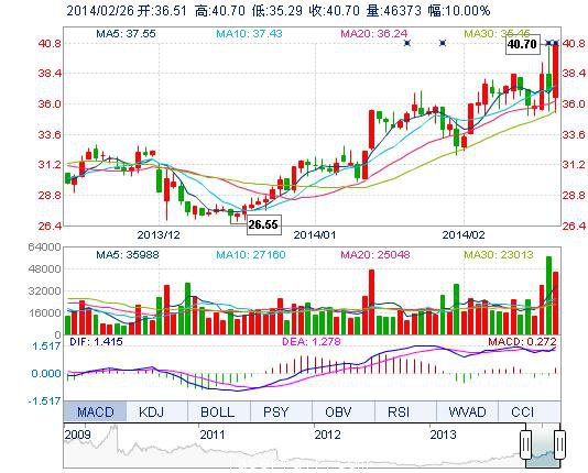 今開: 36.51 成交量: 4.64萬(wan) 手 振幅: 14.62% 最高: 40.70 成交額: 1.79億(yi) 元 換手率: 1.34% 最低: 35.29 總市值: 176.34億(yi) 市淨率: 10.86 昨收: 37.00 流通市...