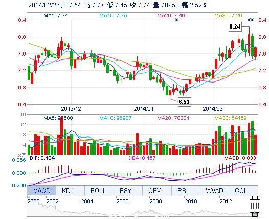 今開: 7.54 成交量: 7.90萬(wan) 手 振幅: 4.24% 最高: 7.77 成交額: 6019.10萬(wan) 元 換手率: 1.81% 最低: 7.45 總市值: 33.81億(yi) 市淨率: 2.47 昨收: 7.55 流通市值: ...