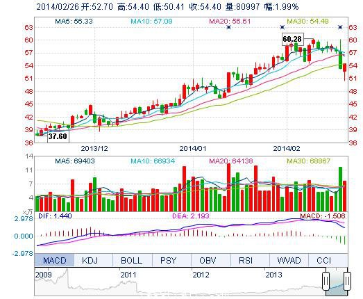 今開: 52.70 成交量: 8.10萬(wan) 手 振幅: 7.48% 最高: 54.40 成交額: 4.26億(yi) 元 換手率: 2.82% 最低: 50.41 總市值: 161.93億(yi) 市淨率: 10.66 昨收: 53.34 流通市值...