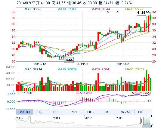 | 最 高: | 41.75 | 成交額: | 1.38億元 | 換手率: | 1.00% |