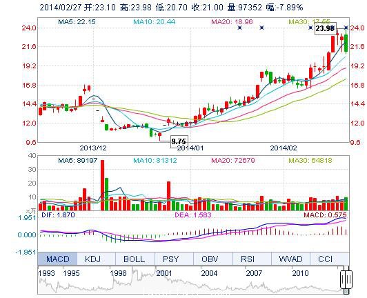 | 今 開: | 23.10 | 成交量: | 9.74萬手 | 振 幅: | 14.39% |
