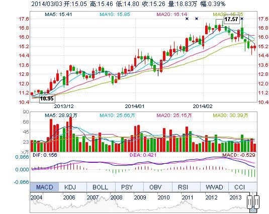 今開: 15.05 成交量: 18.83萬(wan) 手 振幅: 4.34% 最高: 15.46 成交額: 2.86億(yi) 元 換手率: 1.98% 最低: 14.80 總市值: 160.57億(yi) 市淨率: 4.56 昨收: 15.20 流通市值...