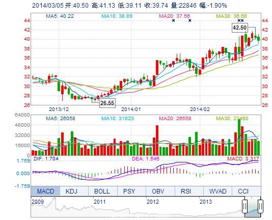 今開: 40.50 成交量: 2.28萬(wan) 手 振幅: 4.99% 最高: 41.13 成交額: 9078.35萬(wan) 元 換手率: 0.66% 最低: 39.11 總市值: 172.18億(yi) 市淨率: 10.60 昨收: 40.51 流通...