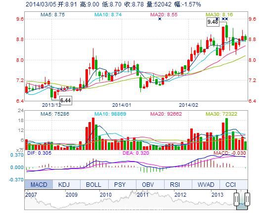 | 今 開: | 8.91 | 成交量: | 5.20萬手 | 振 幅: | 3.36% |