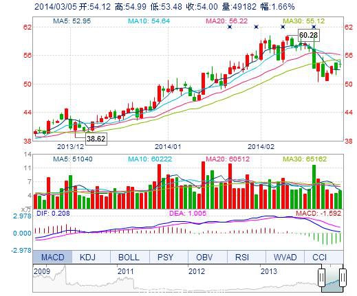 今開: 54.12 成交量: 4.92萬(wan) 手 振幅: 2.84% 最高: 54.99 成交額: 2.67億(yi) 元 換手率: 1.71% 最低: 53.48 總市值: 160.74億(yi) 市淨率: 10.59 昨收: 53.12 流通市值...