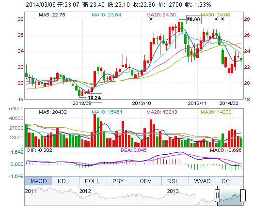 今開: 23.07 成交量: 1.27萬(wan) 手 振幅: 5.58% 最高: 23.40 成交額: 2866.48萬(wan) 元 換手率: 5.86% 最低: 22.10 總市值: 16.00億(yi) 市淨率: 5.48 昨收: 23.31 流通市...
