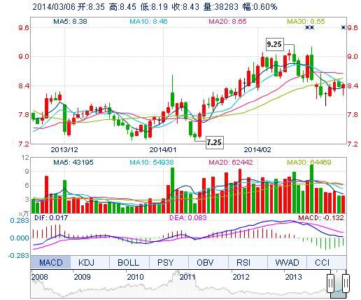 | 今 開: | 8.35 | 成交量: | 3.83萬手 | 振 幅: | 3.10% |