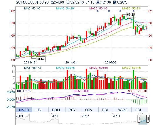 今開: 53.96 成交量: 4.21萬(wan) 手 振幅: 4.02% 最高: 54.69 成交額: 2.27億(yi) 元 換手率: 1.47% 最低: 52.52 總市值: 161.18億(yi) 市淨率: 10.61 昨收: 54.00 流通市值...