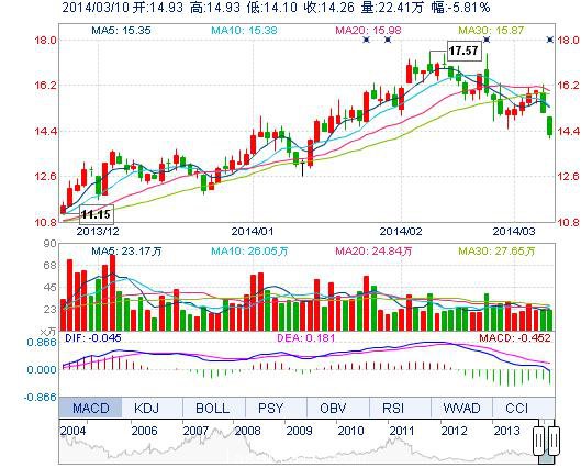 今開: 14.93 成交量: 22.41萬(wan) 手 振幅: 5.48% 最高: 14.93 成交額: 3.25億(yi) 元 換手率: 2.35% 最低: 14.10 總市值: 150.05億(yi) 市淨率: 4.26 昨收: 15.14 流通市值...