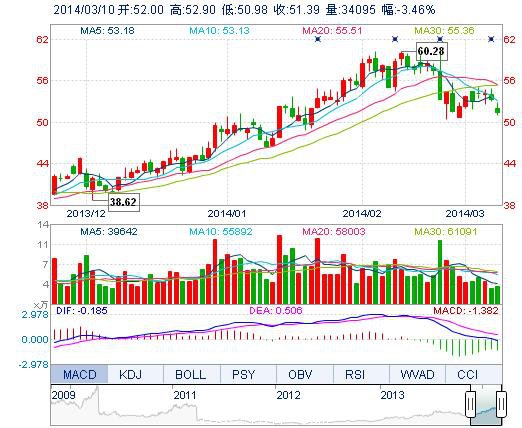 今開: 52.00 成交量: 3.41萬(wan) 手 振幅: 3.61% 最高: 52.90 成交額: 1.76億(yi) 元 換手率: 1.19% 最低: 50.98 總市值: 152.97億(yi) 市淨率: 10.07 昨收: 53.23 流通市值...
