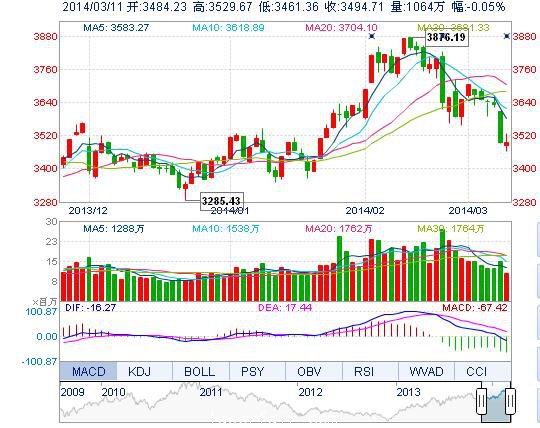 今開: 3484.23 最高: 3529.67 昨收: 3496.55 最低: 3461.36 成交量: 1063.54萬(wan) 手 振幅: 1.95% 成交額: 151.00億(yi) 元