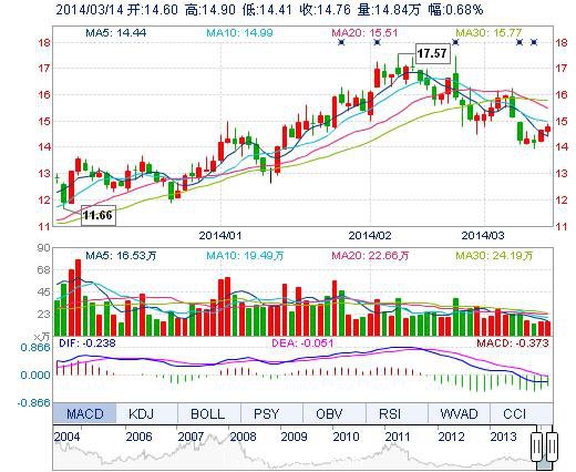 今開: 14.60 成交量: 14.84萬(wan) 手 振幅: 3.34% 最高: 14.90 成交額: 2.19億(yi) 元 換手率: 1.56% 最低: 14.41 總市值: 155.31億(yi) 市淨率: 4.41 昨收: 14.66 流通市值...