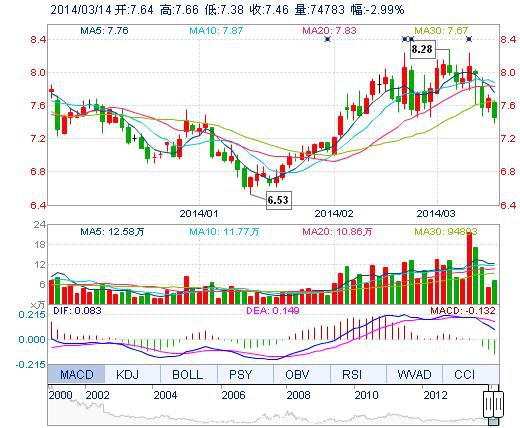 | 今 開: | 7.64 | 成交量: | 7.48萬手 | 振 幅: | 3.64% |