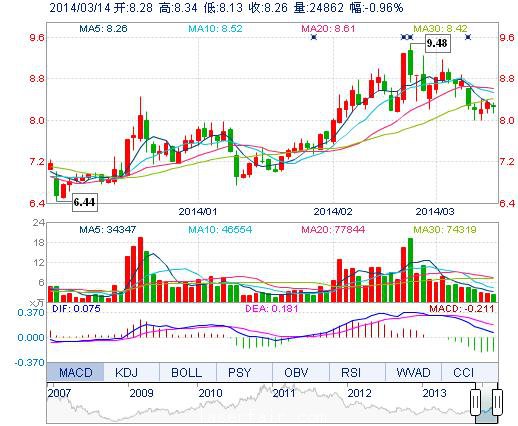 | 今 開: | 8.28 | 成交量: | 2.49萬手 | 振 幅: | 2.52% |