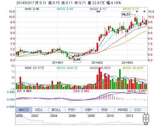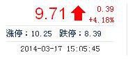 今開: 9.31 成交量: 22.01萬(wan) 手 振幅: 6.87% 最高: 9.75 成交額: 2.08億(yi) 元 換手率: 2.47% 最低: 9.11 總市值: 86.53億(yi) 市淨率: 3.26 昨收: 9.32 流通市值: 86...
