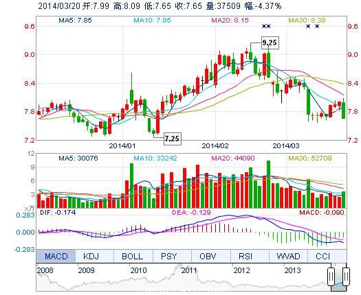 今開: 7.99 成交量: 3.75萬(wan) 手 振幅: 5.50% 最高: 8.09 成交額: 2964.28萬(wan) 元 換手率: 1.36% 最低: 7.65 總市值: 21.80億(yi) 市淨率: 3.50 昨收: 8.00 流通市值: ...