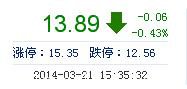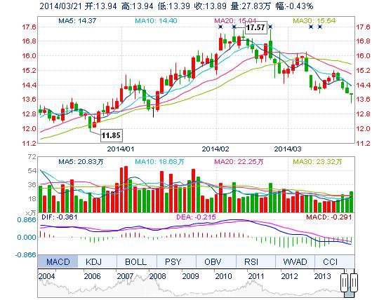 今開: 13.94 成交量: 27.83萬(wan) 手 振幅: 3.94% 最高: 13.94 成交額: 3.80億(yi) 元 換手率: 2.92% 最低: 13.39 總市值: 146.16億(yi) 市淨率: 4.15 昨收: 13.95 流通市值...