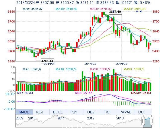 今開: 3497.95 最高: 3500.47 昨收: 3501.36 最低: 3471.11 成交量: 1024.83萬(wan) 手 振幅: 0.84% 成交額: 135.57億(yi) 元