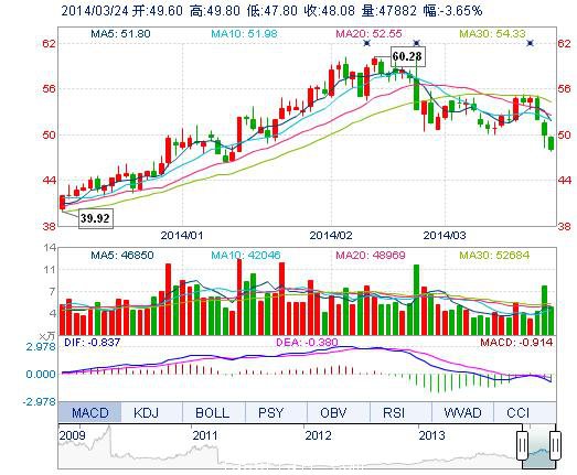 | 最 高: | 49.80 | 成交額: | 2.33億元 | 換手率: | 1.67% |