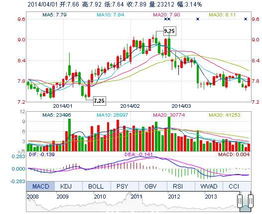 | 今 開: | 7.66 | 成交量: | 2.32萬手 | 振 幅: | 3.66% |