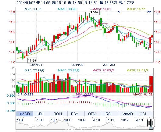 今開: 14.56 成交量: 48.38萬(wan) 手 振幅: 4.53% 最高: 15.16 成交額: 7.19億(yi) 元 換手率: 5.07% 最低: 14.50 總市值: 155.84億(yi) 市淨率: 4.43 昨收: 14.56 流通市值...