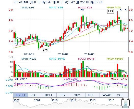 | 今 開: | 8.36 | 成交量: | 2.55萬手 | 振 幅: | 1.67% |