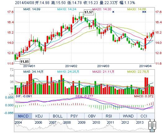 今開: 14.98 成交量: 22.33萬(wan) 手 振幅: 4.78% 最高: 15.50 成交額: 3.37億(yi) 元 換手率: 2.34% 最低: 14.78 總市值: 160.26億(yi) 市淨率: 4.55 昨收: 15.06 流通市值...