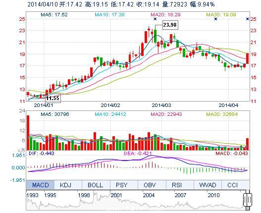 | 今 開: | 17.42 | 成交量: | 7.29萬手 | 振 幅: | 9.94% |