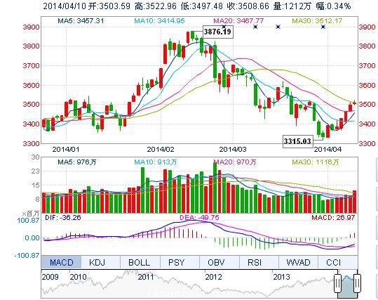 今開: 3503.59 最高: 3522.96 昨收: 3496.89 最低: 3497.48 成交量: 1211.68萬(wan) 手 振幅: 0.73% 成交額: 158.86億(yi) 元