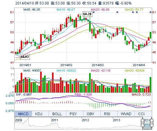 | 今 開: | 53.08 | 成交量: | 9.36萬手 | 振 幅: | 5.45% |