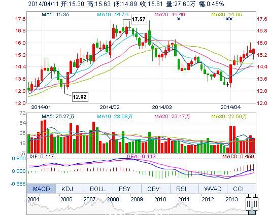 | 今 開: | 15.30 | 成交量: | 27.60萬手 | 振 幅: | 4.76% |