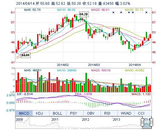 今開: 50.68 成交量: 4.35萬(wan) 手 振幅: 4.42% 最高: 52.62 成交額: 2.25億(yi) 元 換手率: 1.51% 最低: 50.38 總市值: 155.32億(yi) 市淨率: 9.62 昨收: 50.65 流通市值...