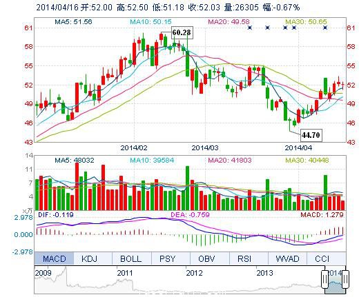 | 最 高: | 52.50 | 成交額: | 1.36億元 | 換手率: | 0.91% |
