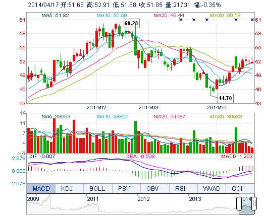 | 今 開: | 51.68 | 成交量: | 2.17萬手 | 振 幅: | 2.36% |