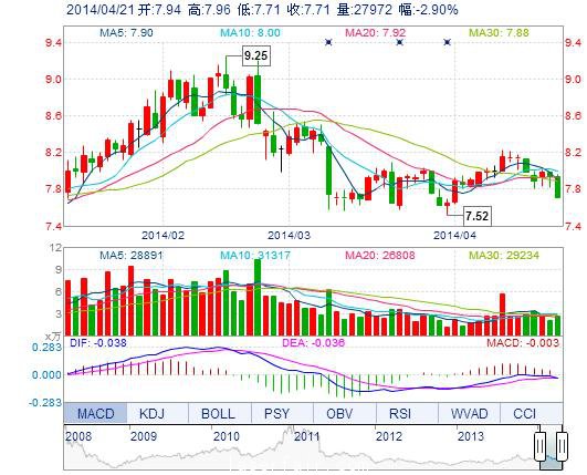 今開: 7.94 成交量: 2.80萬(wan) 手 振幅: 3.15% 最高: 7.96 成交額: 2195.08萬(wan) 元 換手率: 1.02% 最低: 7.71 總市值: 21.97億(yi) 市淨率: 3.52 昨收: 7.94 流通市值: ...