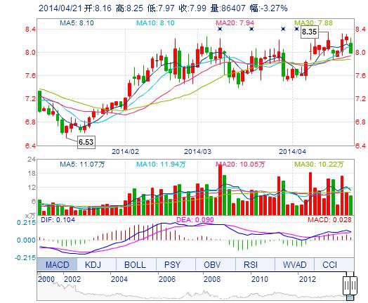 | 今 開: | 8.16 | 成交量: | 8.64萬(wan) 手 | 振 幅: | 3.39% |