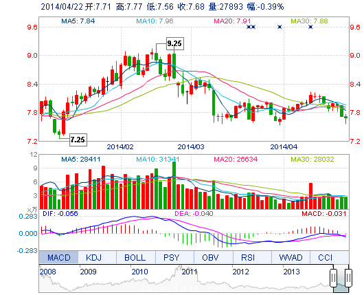今 開: | 7.71 | 成交量: | 2.79萬手 | 振 幅: | 2.72% |
