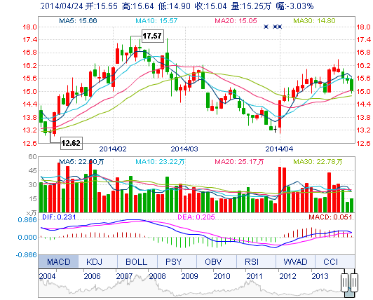 | 今 開: | 15.55 | 成交量: | 15.25萬手 | 振 幅: | 4.77% |