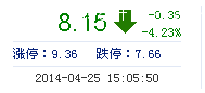 今開: 8.53 成交量: 19.96萬(wan) 手 振幅: 5.88% 最高: 8.60 成交額: 1.65億(yi) 元 換手率: 2.24% 最低: 8.10 總市值: 72.63億(yi) 市淨率: 2.71 昨收: 8.51 流通市值: 72...