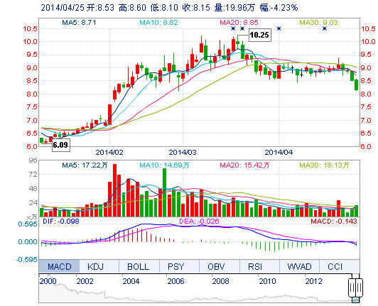 | 最 高: | 8.60 | 成交額: | 1.65億元 | 換手率: | 2.24% |
