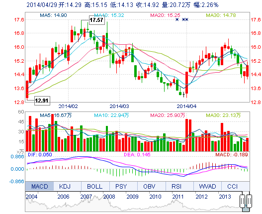 今開: 14.29 成交量: 20.72萬(wan) 手 振幅: 6.99% 最高: 15.15 成交額: 3.06億(yi) 元 換手率: 2.17% 最低: 14.13 總市值: 157.00億(yi) 市淨率: -- 昨收: 14.59 流通市值:...