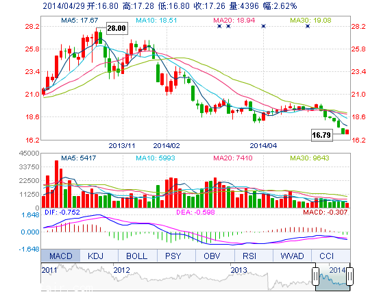 | 今 開: | 16.80 | 成交量: | 4396手 | 振 幅: | 2.85% |