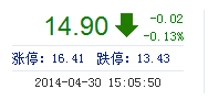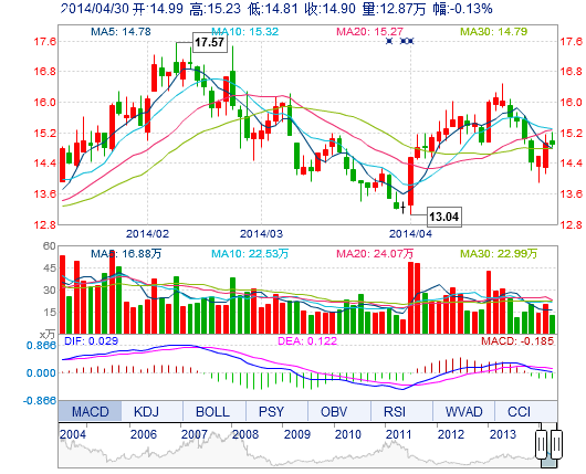 | 今 開: | 14.99 | 成交量: | 12.87萬手 | 振 幅: | 2.82% |
