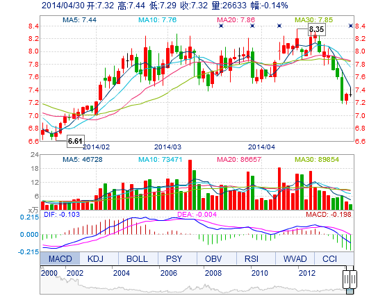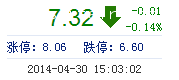 | 今 開: | 7.32 | 成交量: | 2.66萬手 | 振 幅: | 2.05% |